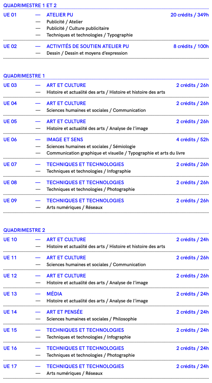 Au fil de leur formation, les étudiants abordent de manière progressive les modes d’expression et les stratégies conceptuelles utilisés en publicité. Et ce, dans le but de leur garantir un maximum de chances d’insertion professionnelle.